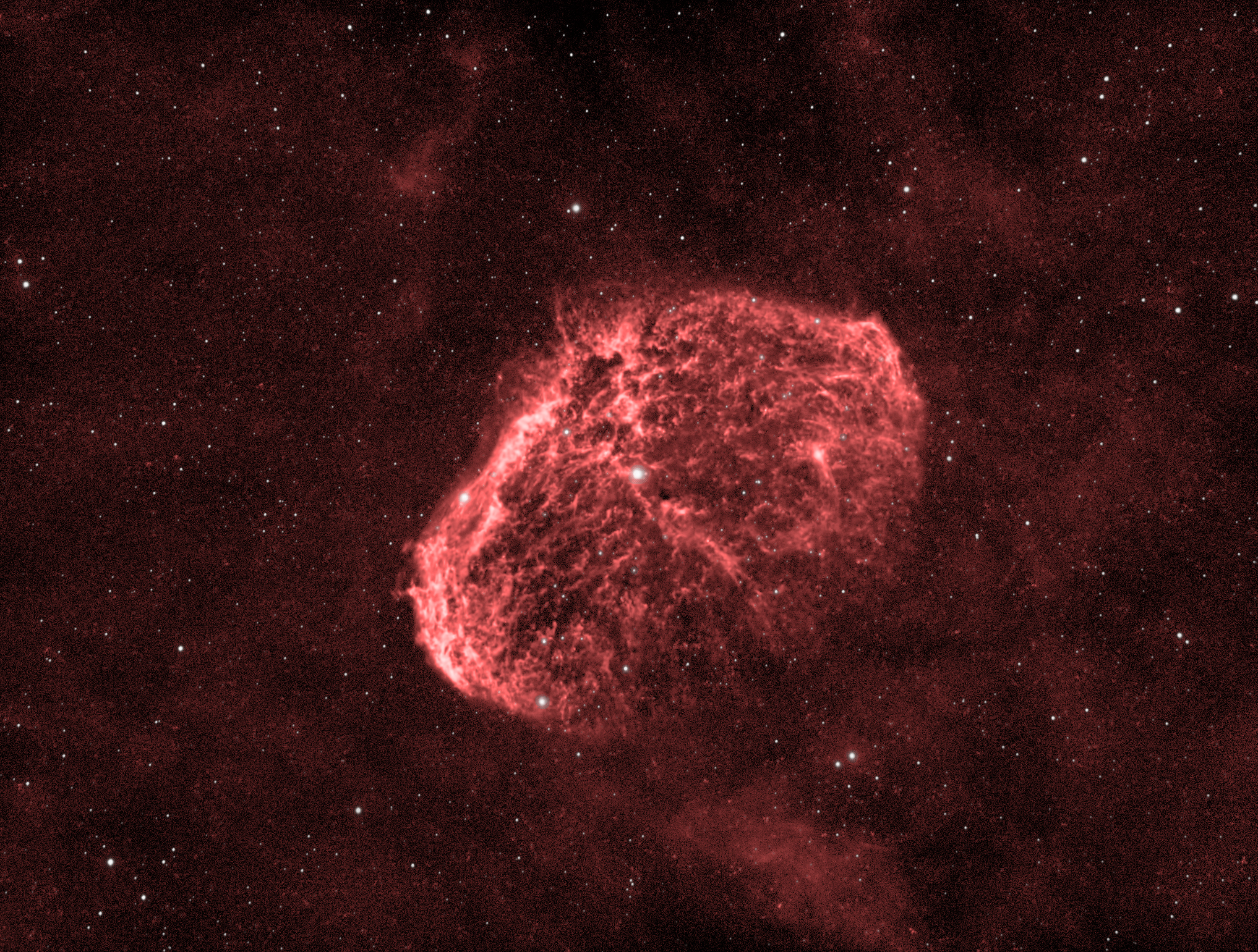 | First try using RGB to correct star colors. Only a minute each with Red, Green, and Blue filters. That data is only used to overlay the color on the H-alpha luminance data. You can see that some of the stars are actually blue or yellow. |